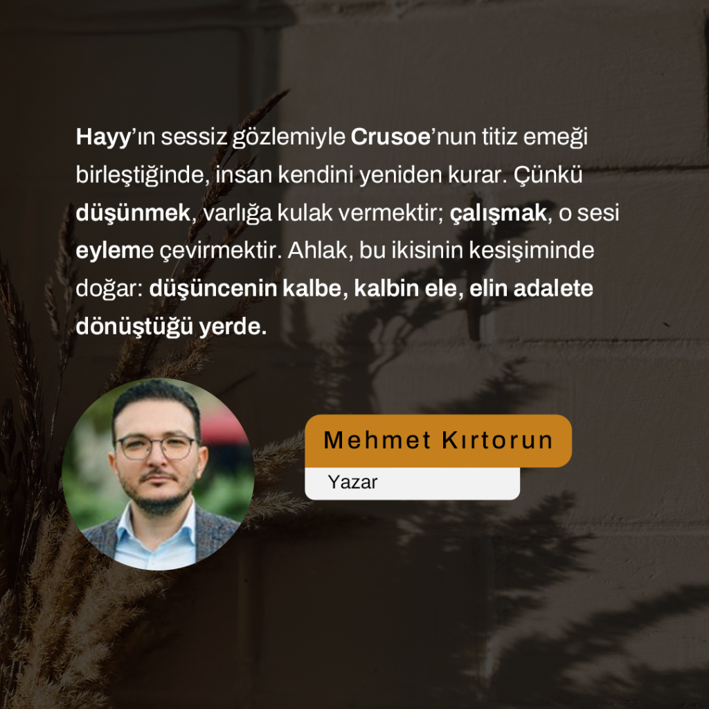 Hayy’ın sessiz gözlemiyle Crusoe’nun titiz emeği birleştiğinde, insan kendini yeniden kurar. Çünkü düşünmek, varlığa kulak vermektir; çalışmak, o sesi eyleme çevirmektir. Ahlak, bu ikisinin kesişiminde doğar: düşüncenin kalbe, kalbin ele, elin adalete dönüştüğü yerde.
